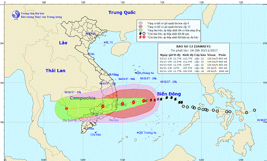 Hướng di chuyển của bão Damrey. (Nguồn Ảnh: Báo Khánh Hòa điện tử)