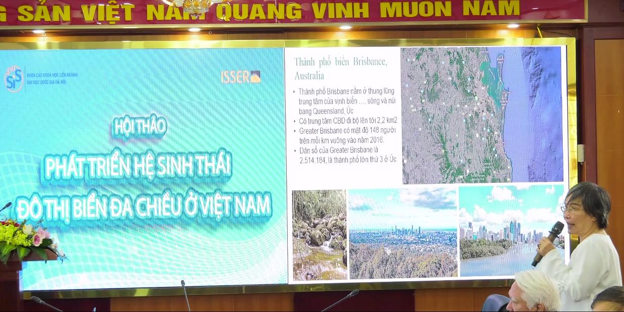 Tại Hội thảo, các đại biểu đã nghe các báo cáo viên trình bày các tham luận gồm: Báo cáo tổng quan về tầm nhìn và cách tiếp cận liên ngành trong phát triển Hệ sinh thái đô thị biển đa chiều; Phát triển không gian kinh tế biển Việt Nam gắn với Hệ sinh thái đô thị biển đa chiều trong bối cảnh mới; Phát triển các Cực kinh tế đô thị biển – Nhà nước đóng vai trò dẫn đường; Khung đánh giá đa chiều cho phát triển Hệ sinh thái đô thị biển – công cụ quản lý tổng hợp trong phát triển; Đổi mới cách tiếp cận Hệ sinh thái – xã hội để phát triển bền vững đô thị biển trong bối cảnh biến đổi khí hậu; Dịch vụ hệ sinh thái gắn với mục tiêu bảo tồn khu dự trữ sinh quyển rừng ngập mặn – Nghiên cứu điểm cho Cần Giờ; Chủ nghĩa đô thị xanh ứng dụng trong phát triển Hệ sinh thái đô thị biển đa chiều tại Việt Nam; Tổng quan hiện trạng đô thị biển Việt Nam và một số quan điểm về kiểm soát phát triển; Liên kết địa bàn giữa cảng nước sâu Cái Mép – Thị Vải và Đô thị lõi cận kề.