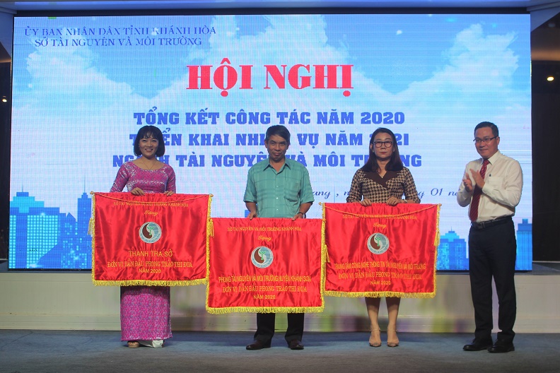Ông Nguyễn Văn Đồng – Giám đốc Sở trao cờ thi cho 03 đơn vị dẫn đầu phong trào thi đua năm 2020.