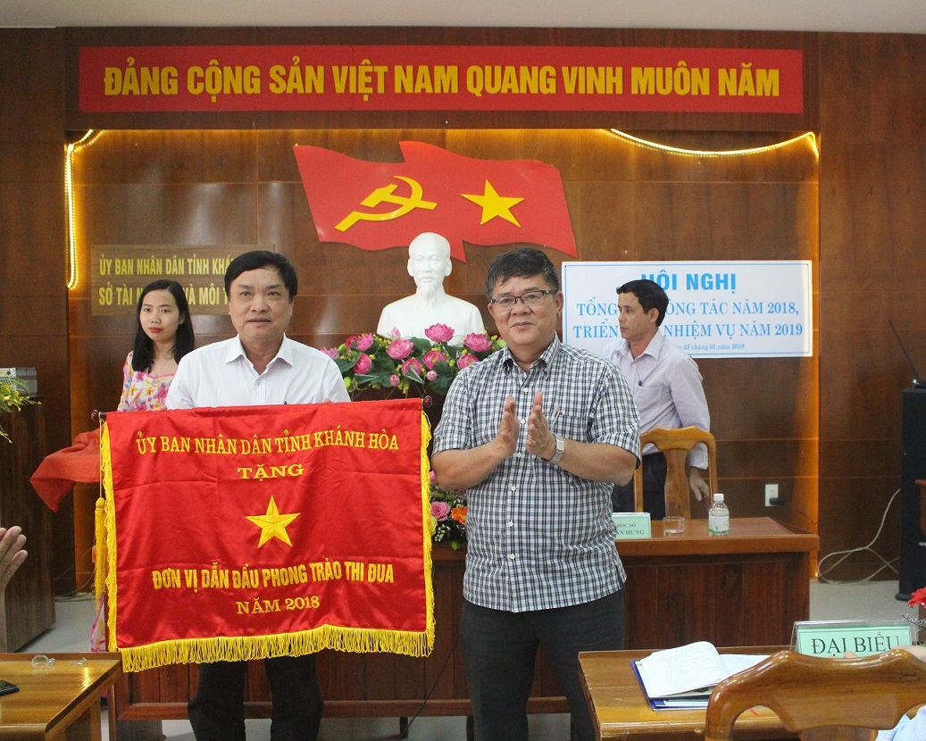 Ông Mai Xuân Hưng – Phó Giám đốc Sở tặng “Cờ thi đua của UBND tỉnh” cho Văn phòng Đăng ký đất đai tỉnh Khánh Hòa.