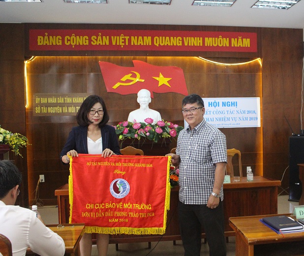 Ông Mai Xuân Hưng – Phó Giám đốc Sở tặng cờ thi đua xuất sắc cho Chi cục Bảo vệ môi trường đơn vị dẫn đầu phong trào thi đua năm 2018.