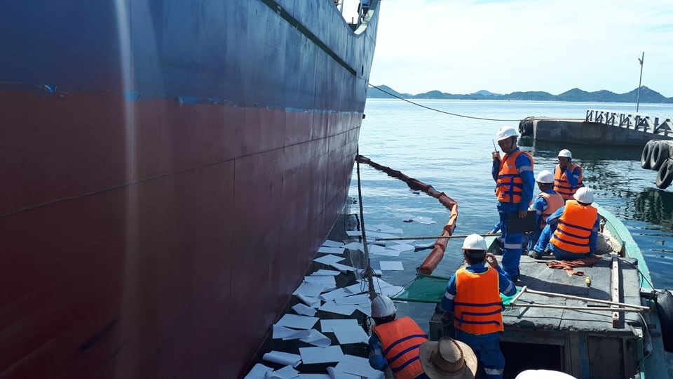 Theo đó, tình huống giả định là vào lúc 8h00 sáng, tại khu vực Cảng Trạm nghiền Cam Ranh, khi tàu chở clinker cập cảng đã đâm va vào mố cầu làm thủng tàu và két chứa nhiên liệu dầu DO, dầu DO tràn ra biển. Đặc điểm của dầu DO là nhẹ, khi tràn ra biển chủ yếu lan truyền trên mặt nước và dễ bay hơi. Diễn biến thời tiết, thủy văn: thủy triều đang xuống, dòng chảy tầng mặt với tốc độ trung bình 0.1 m/s, kết hợp với gió Nam làm cho dầu lan trên mặt nước về hướng Bắc. Khả năng sẽ ảnh hưởng đến các đầm nuôi thủy hải sản gần bờ khu vực xã Cam Thịnh Đông giáp phường Cam Linh và khu cảng cá phường Cam Linh. Khi phát hiện tàu đâm va vào mố cầu cảng và rò rỉ dầu thì phải gọi điện thoại/bộ đàm báo cáo Trưởng ca, Ban Quản đốc Xưởng xi măng, Trưởng phòng Hậu cần. Chuẩn bị các thiết bị ứng phó tràn dầu tại cảng, bao gồm: phao quay dầu, giấy thấm dầu, dây thừng, bình chữa cháy, vợt để vớt giấy thấm dầu, áo phao, phao cứu sinh, bè cứu sinh… Đồng thời báo cáo sự cố cho các cơ quan chức năng (bằng điện thoại): Sở Tài nguyên và Môi trường, Cảng vụ Hàng Hải Nha Trang, Bộ đội Biên phòng Cam Ranh,… Sau đó, đội ứng phó sự cố tràn dầu sẽ chia làm 02 nhóm. Nhóm 1 di chuyển nhanh ra cảng để phối hợp với thủy thủ đoàn xác định khối lượng dầu tràn, đồng thời xác định hướng và phạm vi dầu loang dựa vào thời tiết hiện tại, báo cáo cho Giám đốc/Ban chỉ huy. Nhóm 2 chuẩn bị ca nô lai dắt, chở thiết bị, dụng cụ. Huy động thêm tàu, ghe xung quanh để hỗ trợ. Đội ứng phó sự cố tràn dầu dùng ca nô di chuyển nhanh ra cầu cảng tiếp nhận các thiết bị đến hiện trường. Sử dụng 01 cano và 01 ghe thuyền để lai dắt phao quây dầu khoanh vùng nước có dầu loang. Có thể khoanh vùng dầu loang theo hình chữ U hoặc hình trong. Ưu tiên ngăn chặn dầu theo hướng Bắc. Sau khi khoanh vùng dầu loang thì tiến hành sử dụng giấy thấm dầu để hút dầu trong vùng phao quây. Giấy nhiễm dầu sẽ được dùng vợt để vớt lên chứa vào thùng nhựa, sau đó được đưa vào bờ và tập kết vào kho chất thải nguy hại. Cuối cùng là thu gom phao quay dầu, cuộn gọi và bảo quản tại cảng.