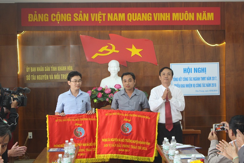Cũng tại Hội nghị, Lãnh đạo Sở Tài nguyên và Môi trường đã Tặng cờ thi đua xuất sắc năm 2017 cho Phòng Tài nguyên và Môi trường huyện Khánh Vĩnh – Đơn vị dẫn đầu Khối thi đua các Phòng Tài nguyên và Môi trường cấp huyện và Phòng Nuớc – KTTV&BĐKH – đơn vị dẫn đầu Khối thi đua các phòng, Chi cục QLNN thuộc Sở.