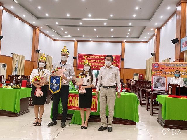 Ông Ngô Hữu Hiền - Thành ủy viên, Phó chủ tịch UBND thành phố Cam Ranh trao giải và phần thưởng cho đội thi đạt giải 3 tại điểm cầu Cam Ranh. (Ảnh: Hà - CĐCS Phòng TNMT)