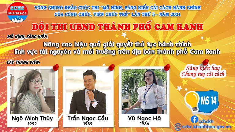Hưởng ứng cuộc thi “ Mô hình, sáng kiến cái cách hành chính của công chức, viên chức trẻ” lần thứ 5 – năm 2021 do UBND tỉnh, UBND thành phố phát động. Phòng Tài nguyên và Môi trường đã gửi sáng kiến đăng ký dự thi với nội dung “Nâng cao hiệu quả giải quyết thủ tục hành chính lĩnh vực tài nguyên và môi trường trên địa bàn thành phố Cam Ranh”. Kết quả sáng kiến đã được chọn dự thi vào vòng thi chung khảo.