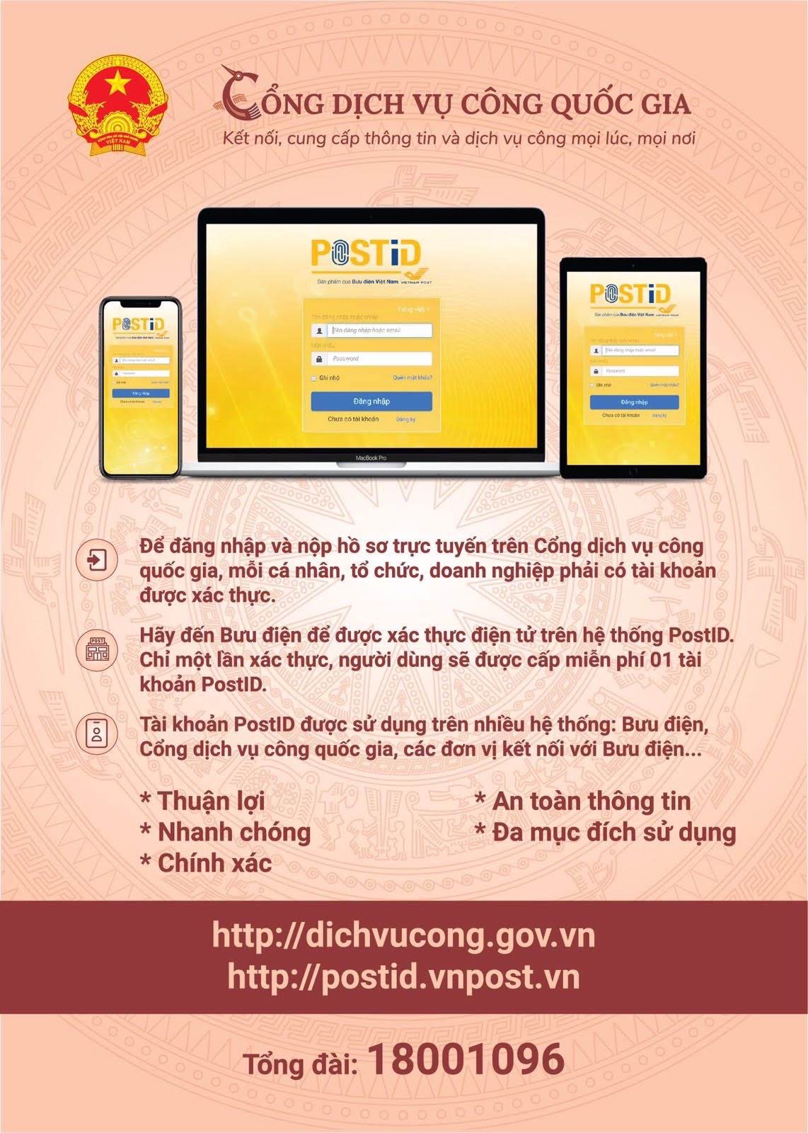 Cách 2: Đăng ký trực tiếp: Bưu cục hỗ trợ đăng ký tài khoản PostID cho khách hàng tại Bưu cục, sau đó thực hiện xác minh: Cá nhân, tổ chức có thể mang giấy tờ theo quy định đến điểm giao dịch Bưu điện cung cấp dịch vụ để đăng ký tài khoản định danh, xác thực và thực hiện dịch vụ công trực tuyến.