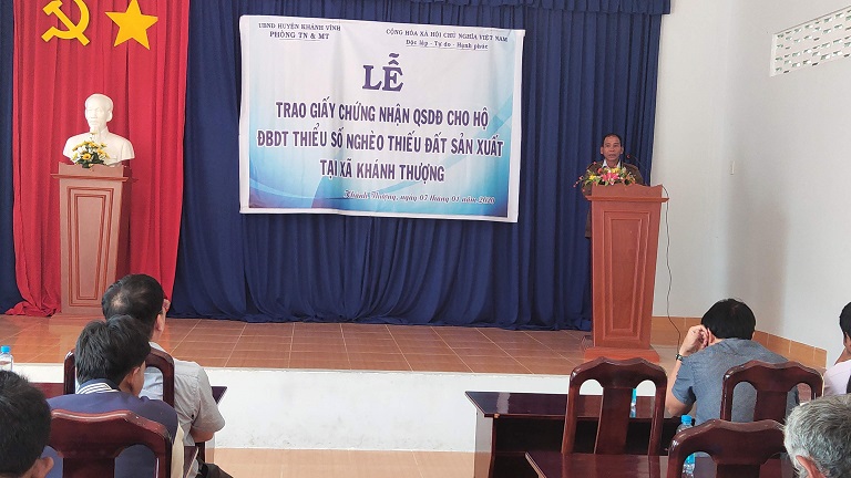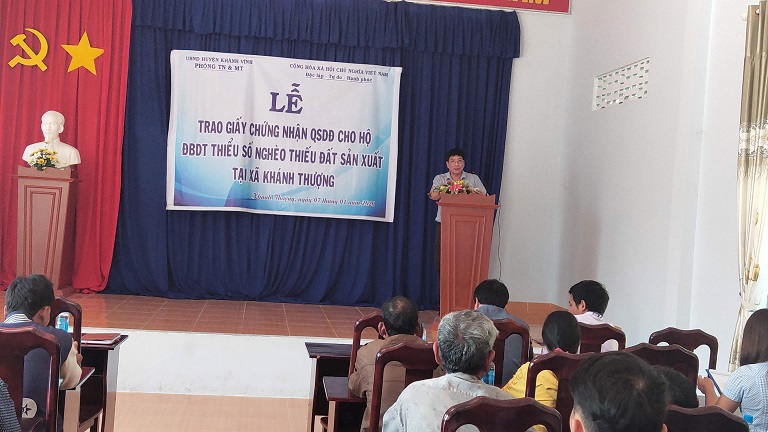 Thực hiện Công văn số 9511/UBND-KT ngày 17/9/2018 của UBND tỉnh Khánh Hòa về việc giao đất rừng trồng sau khai thác cho UBND huyện Khánh Vĩnh để giao cho hộ ĐBDTTS nghèo thiếu đất sản xuất; Quyết định số: 1514/QĐ-UBND, 1515/QĐ-UBND, 1516/QĐ-UBND, 1517/QĐ-UBND ngày 21/5/2019 của UBND tỉnh Khánh Hòa về việc thu hồi đất của Công ty TNHH MTV Lâm sản Khánh Hòa đang quản lý, sử dụng giao cho UBND huyện Khánh Vĩnh để giao cho các hộ ĐBDTTS nghèo thiếu đất sản xuất trên địa bàn huyện. Trên cơ sở Phương án giao đất của UBND các xã và đề xuất của Phòng Tài nguyên và Môi trường, UBND huyện thống nhất chủ trương giao đất và cấp giấy chứng nhận QSD đất cho 178 hộ ĐBDTTS nghèo thiếu đất sản xuất có khả năng canh tác, với diện tích 110,43 ha tại các xã: Khánh Phú, Sơn Thái, Giang Ly, Khánh Thượng.