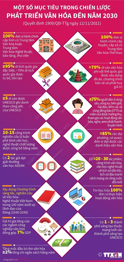 Phát huy mọi nguồn lực phát triển để văn hóa thực sự trở thành sức mạnh nội sinh, động lực khởi dậy mạnh mẽ tinh thần yêu nước, niềm tự hào dân tộc, niềm tin, khát vọng xây dựng đất nước phồn vinh, hạnh phúc; nhân tố thúc đẩy phát triển con người Việt Nam trở thành trung tâm, chủ thể, nguồn lực quan trọng nhất và mục tiêu của sự phát triển.